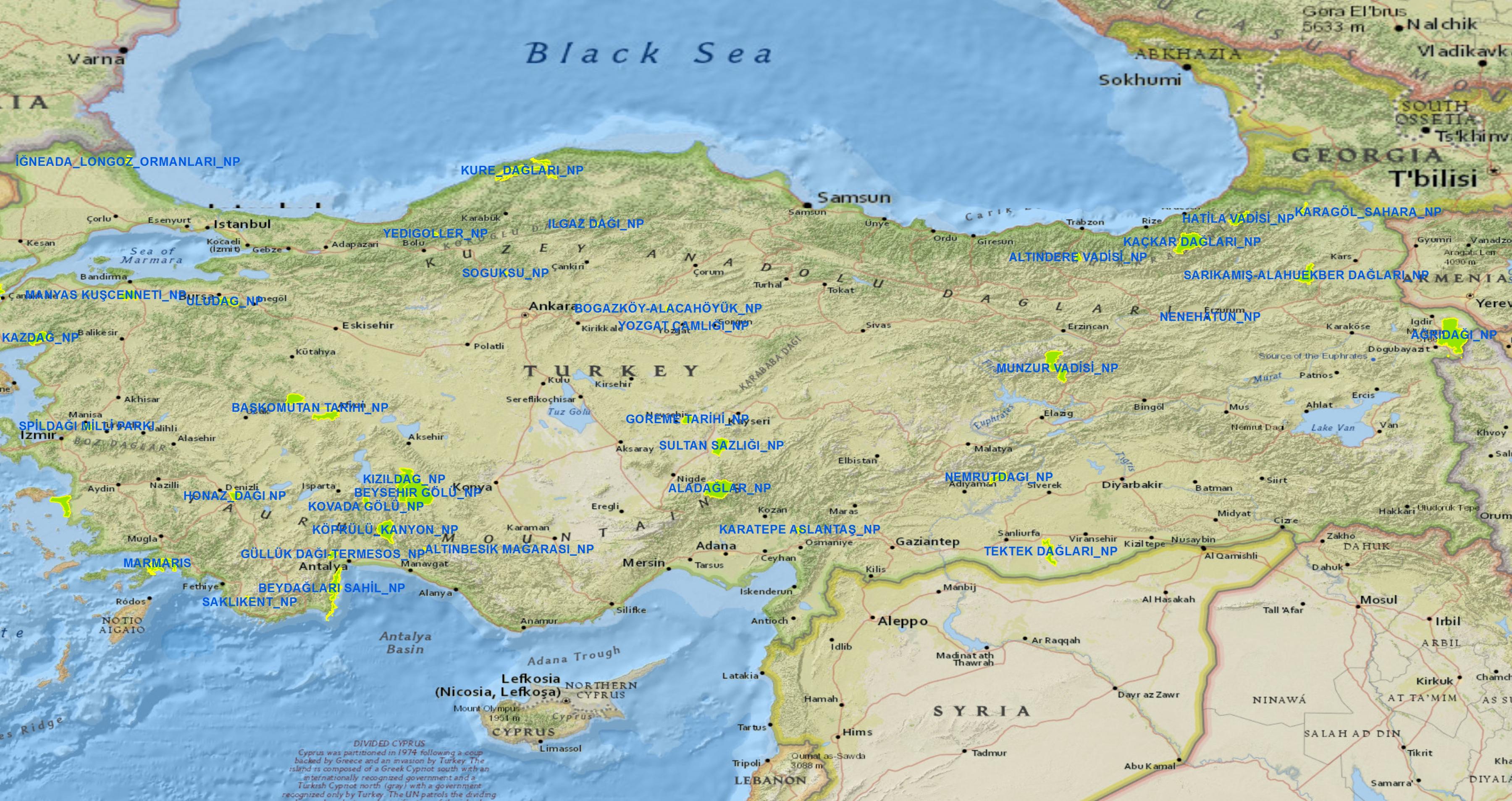 Utworzony jako park narodowy w 1995 roku, Aladağlar znajduje się w południowej Turcji i obejmuje pasmo górskie Gór Anty-Taurus. O powierzchni ponad 55 000 hektarów i wysokości 3500 m n.p.m., ten gigantyczny park narodowy rozciąga się od prowincji Kayseri aż do prowincji Adana, jak to zostało wspomniane na mapie parków narodowych Turcji. Położone w prowincji Konya w środkowej Turcji, jezioro Beyşehir jest ważnym sanktuarium dla jego 140 odmian flory i ponad 16 gatunków ryb słodkowodnych, jak również ptaków wodnych, które rozwijają się w jeziorze. Park Narodowy Nemrut Dağı, ta góra na wysokości ponad 2000 m n.p.m. jest parkiem narodowym o dużym znaczeniu historycznym. Kanion Köprülü, znany ze swojego dzikiego piękna, zawdzięcza swoją nazwę oszałamiającemu kanionowi, który zajmuje obszar około 366 km i sięga w niektórych miejscach nawet 400 m w głąb